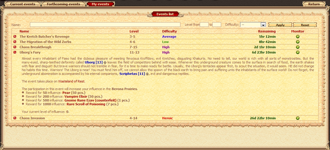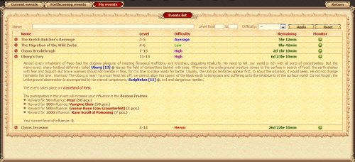 Warriors, rumour has it that some foreign merchant princes have decided to explore new markets by introducing some pretty amazing goods to the inhabitants of Khair and Orgyi. Some time ago, their caravans, laden with the most woundrous and exotic goods from distant lands set out for our part of the world. Now some spotters have reported the train of carts approaching the borders. Excitement spreads like a bush fire across the lands of both the Magmars and the Humans. Young and old, warriors and artisans, farmers and hunters are thrilled at the miracles that are to come!   Our most esteemed Antiquarians established a contact with them, and now the merchants set up their camps at the Antiquarians' places and a trade fair will be held under patronage of both Menachem and Samarij. Everyone is welcome to visit the Wonders Trade Fair, to gape in awe and maybe to obtain some of the rarities crafted by the subtle hands of the foreign artisans. Many an item, both beautiful and most useful, is on stock now! For instance, you could obtain these fine gifts: With just a little luck you could find these valuable pieces of armor in one of the gift boxes: