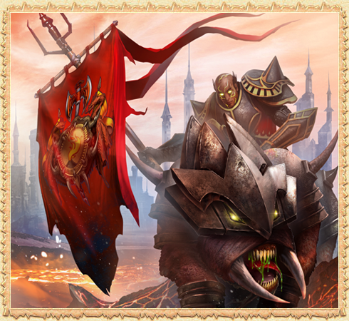 The fire-red flag bearing the crest of the home mainland billows proudly in the hands of the brave defender of Khair. This fierce warrior can count a lot of deeds that made him a hero of the magmar race!